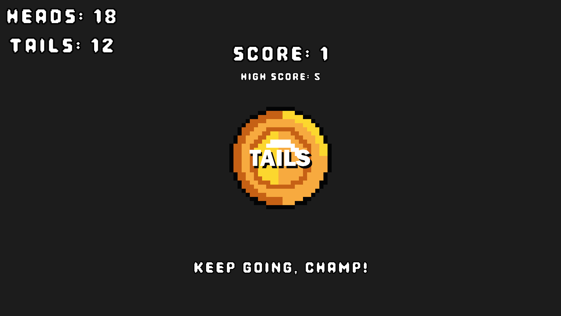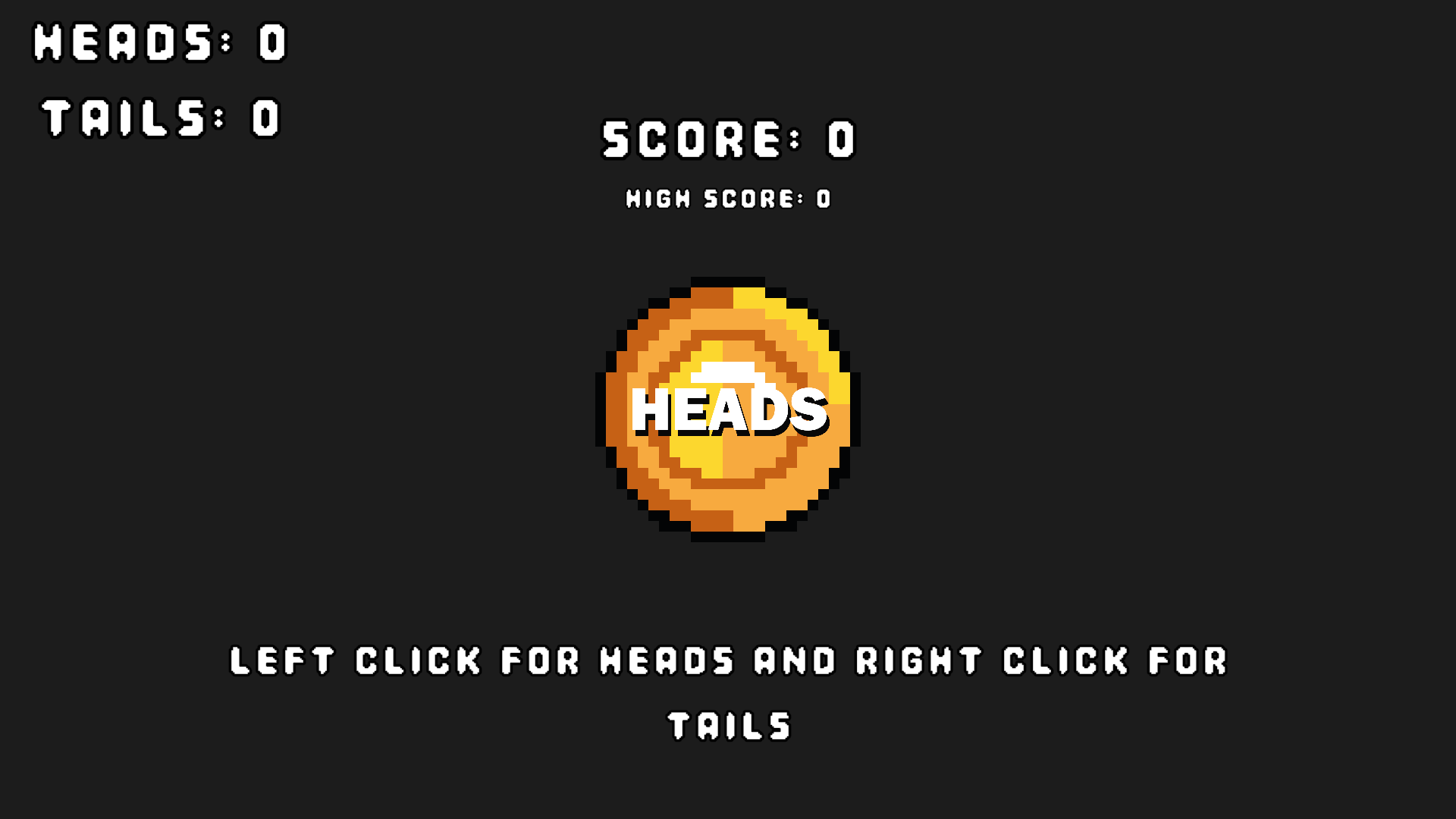 A simple game of heads or tails. Game is still in development (it was made for a game jam but i have plenty of ideas that i want to add). Recommended to play in fullscreen since im new to uploading games and i didnt have the time to learn how to resize it sorry. Also to access the setting you got to hit escape (twice since hitting it once gets you out of the fullscreen and the second time it opens the setting, really sorry about this)